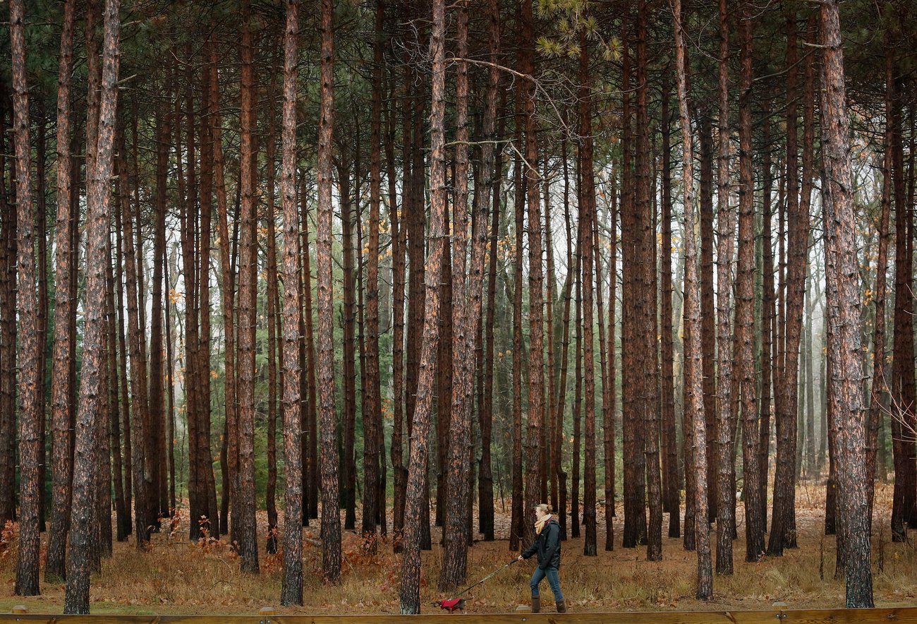 A woman walks her dog past a stand of Red Pine trees in Baxter Woods Park, a natural reserve in the Deering Center neighborhood. (Derek Davis/Staff Photographer)