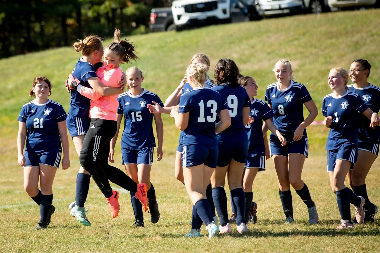 Telstar soccer plays celebrate their 3-1 win over VinalHaven at home. Goalie Mya Buck (in pink) had six saves. (Rose Lincoln/Staff Writer) |