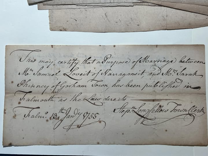 This Jan. 13, 1755, record reveals the marriage certificate of Samuel Loveit of "Narragansit" and Sarah Phinney of "Gorham Town." It was published in Falmouth and signed by Town Clerk Stephen Longfellow, great-grandfather of Henry Wadsworth Longfellow. Suzanne Philips, Gorham Historical Society president, said the certificate was in a box of old records the town of Gorham recently donated to the historical society. Before its incorporation as a town, Gorham was known as Narragansett No. 7. (Courtesy of Gorham Historical Society)