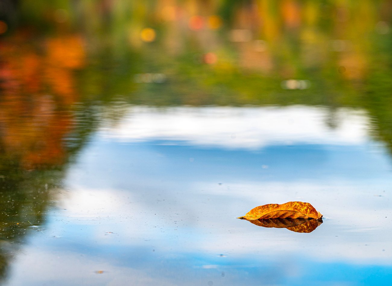 A leaf floats in Torsey Lake in Readfield on Oct. 12, 2023 in front of reflected trees with colorful fall foliage. |