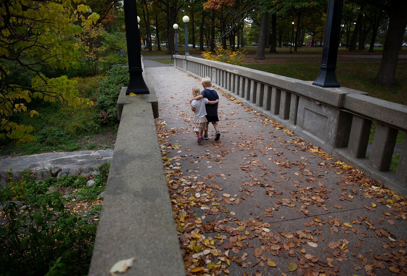 Madison, 2, and Murphy, 4, Doyle of Portland, walk across a footbridge at Deering Oaks park on Oct. 16, 2022. The Doyle family recently moved to Maine from Colorado. BUY IMAGE |