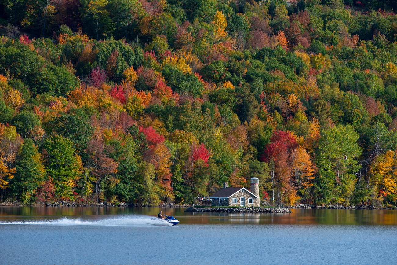 A man rides a personal watercraft in October 2021 across Lake Anasagunticook in Hartford, where leaves were near peak color. The nearly 2-mile long body of water, also known as Canton Lake, also lies partly in that town. |