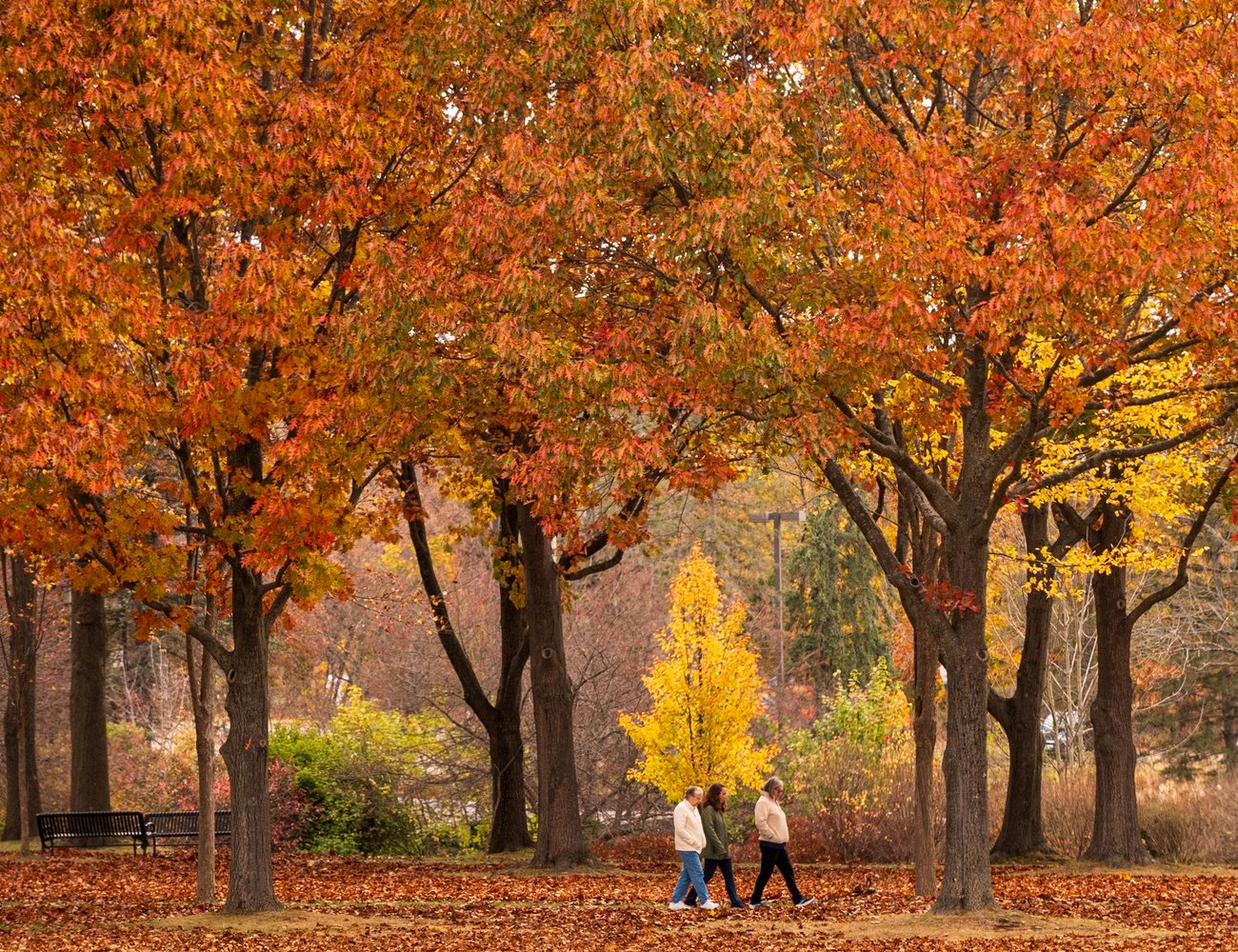 Colorful fall foliage frames a trio of walkers on Nov. 2, 2024, as they stroll through Capitol Park in Augusta. |