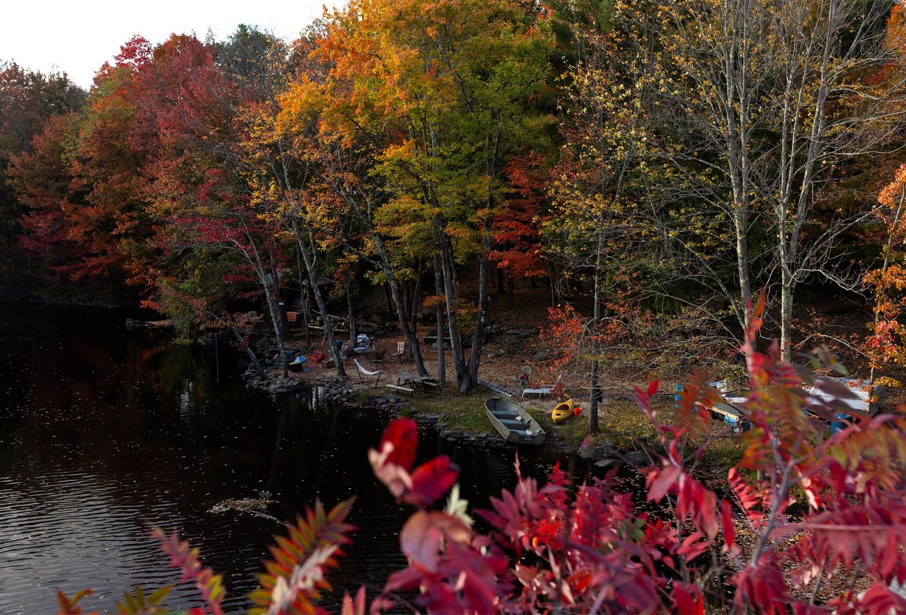 A camp surrounded by colorful foliage seen on the banks of the Salmon Falls River in Lebanon on Oct. 10, 2024. |