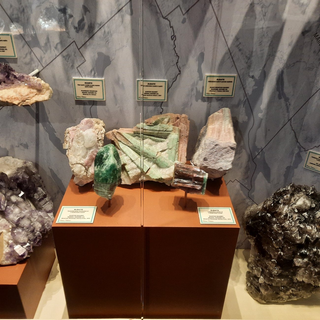 Elbaite tourmaline specimens on display at the Maine Mineral and Gem Museum in Bethel showcase classic Maine pegmatite formations and crystal habits. The display highlights material from the early 1970s Newry “Big Find,” one of the state’s most significant tourmaline discoveries. Readers can learn more about Maine’s tourmaline legacy in the two most recent tourmaline stories. Rebecca Richard/Staff writer |