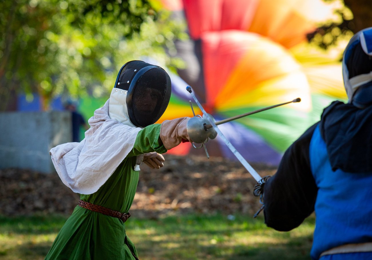 August Butcher fences an opponent Saturday, Aug. 16, 2025, as part of the Society For Creative Anachronism's performances at Simard-Payne Memorial Park. The evening hot air balloon launch was canceled due to windy conditions.