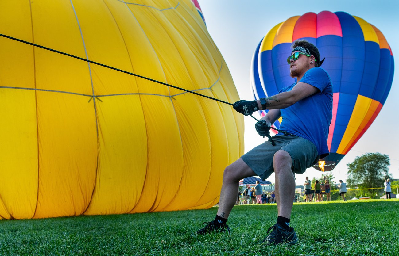 Tate Soucy steadies the crown line for a balloon as others inflate for the Friday evening launch at Simard-Payne Memorial Park. |