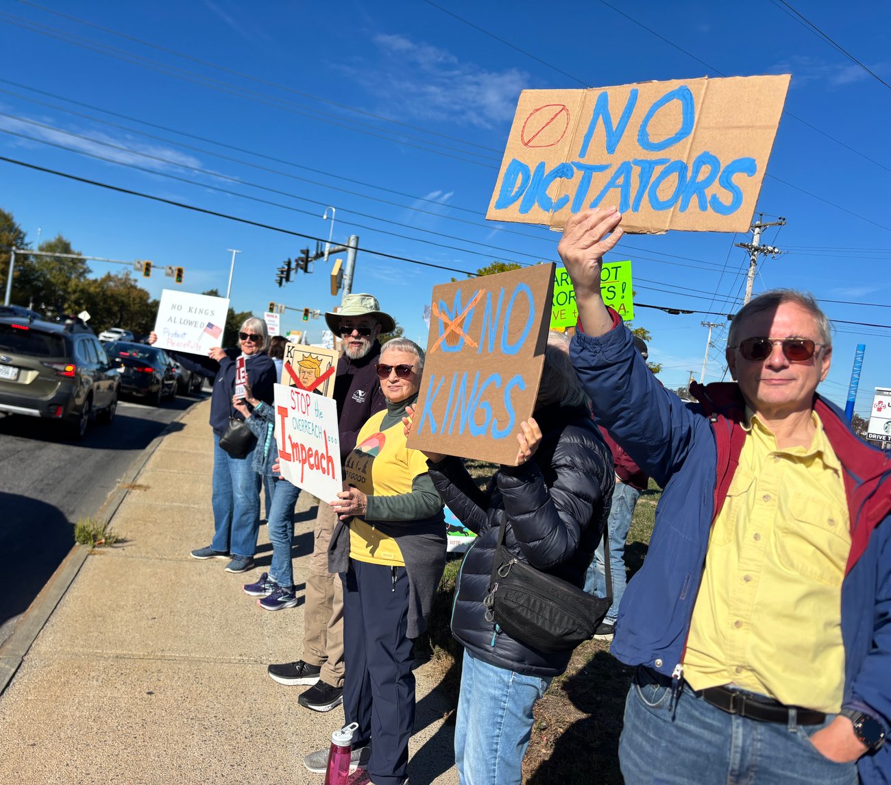 On Saturday morning, protesters gathered on the corner of Waterman Drive, cheering at the honking cars that drove by. The gathering was part of the No Kings demonstrations happening across the state and the nation in protest of the policies of the Trump administration. Dana Richie/Staff Writer |