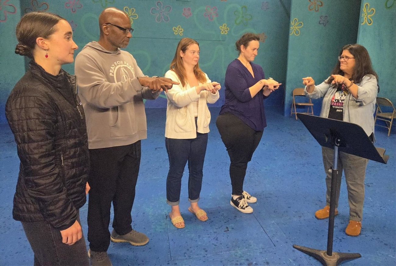 Roxanne Baker, right, an educator and activist in the Maine deaf community, is pictured here teaching American Sign Language to cast members of the upcoming Community Little Theatre production of “A New Home.” The entire cast of 30 is learning ASL interpretation for “One More Goodbye,” one of the musical numbers in the show, according to cast member Roger Philippon. Written by Paul G. Caron, the show’s director and composer, the song is a tribute to the 18 lives lost in the tragic mass shooting that occurred in Lewiston on October 25, 2023. Four of the victims were