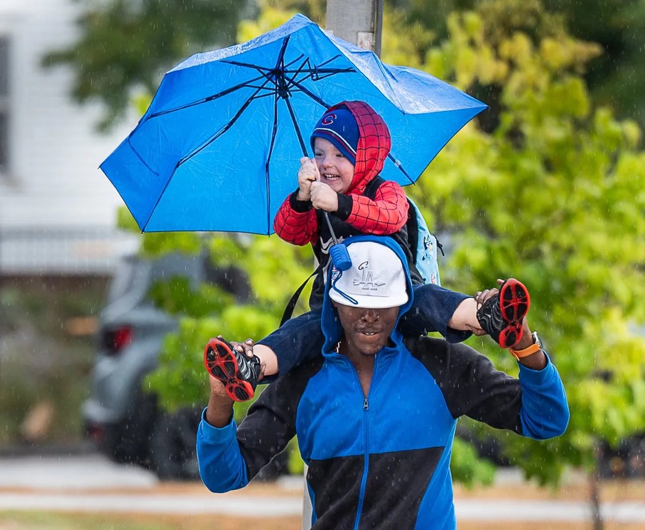 A man, who goes by the name “Savage,” dances recently to music playing on his phone while bouncing his son Malakai on his shoulders on Bates Street in Lewiston. They are on their way to Malakai’s school. (Russ Dillingham/Staff Photographer)