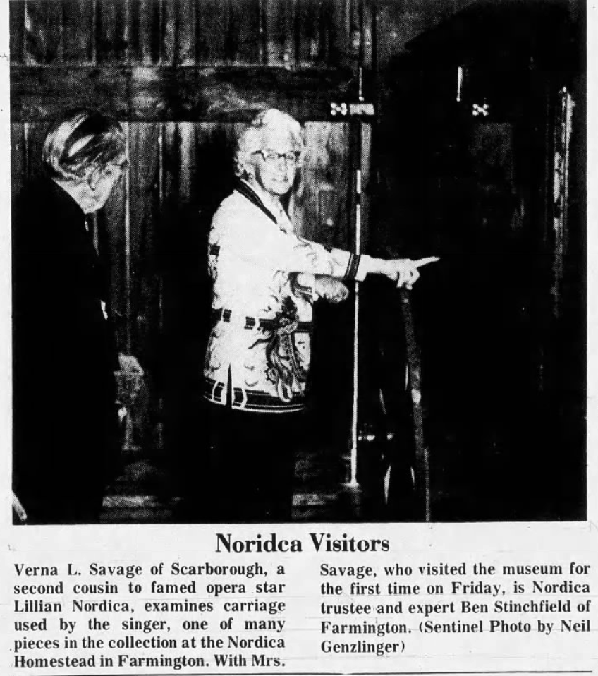 Oct. 31, 1977: Verna L. Savage, of Scarborough, a second cousin to famed opera star Lillian Nordica, examines a carriage used by the singer, one of many pieces in the collection at the Nordica Homestead in Farmington.