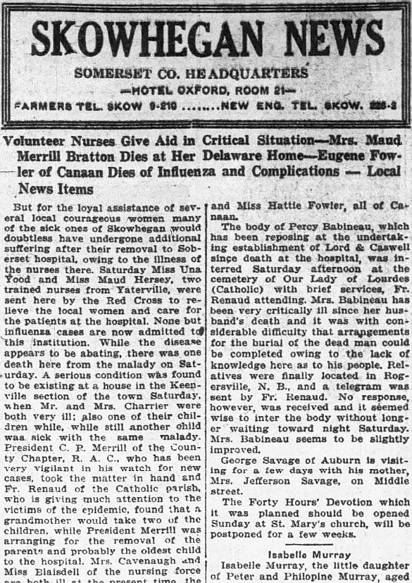 Oct. 21, 1918: "But for the loyal assistance of several local courageous women many of the sick ones of Skowhegan would doubtless have undergone additional after their removal to Somerset hospital, owing to the illness of the nurses there.