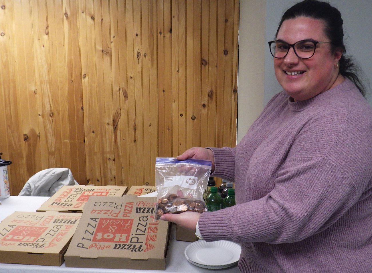 At the Select Board's Community Resiliency Partnership workshop on Feb. 9, Dixfield Town Manager Alicia Conn encouraged attendance with free pizza in exchange for the donation of pennies to address the shortage in the Town Office in making change when people pay taxes or other financial transactions. The effort was a success, she said, noting what was collected should last for awhile. (Bruce Farrin/Staff Writer) |