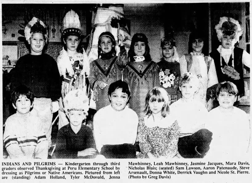 Nov. 29, 1995: Peru Elementary School students observed Thanksgiving by dressing as pilgrims or Native Americans. From left in back row are Adam Holland, Tyler McDonald, Jenna Mawhinney, Lean Mawhinney, Jasmine Jacques, Mara Davis and Nicholas