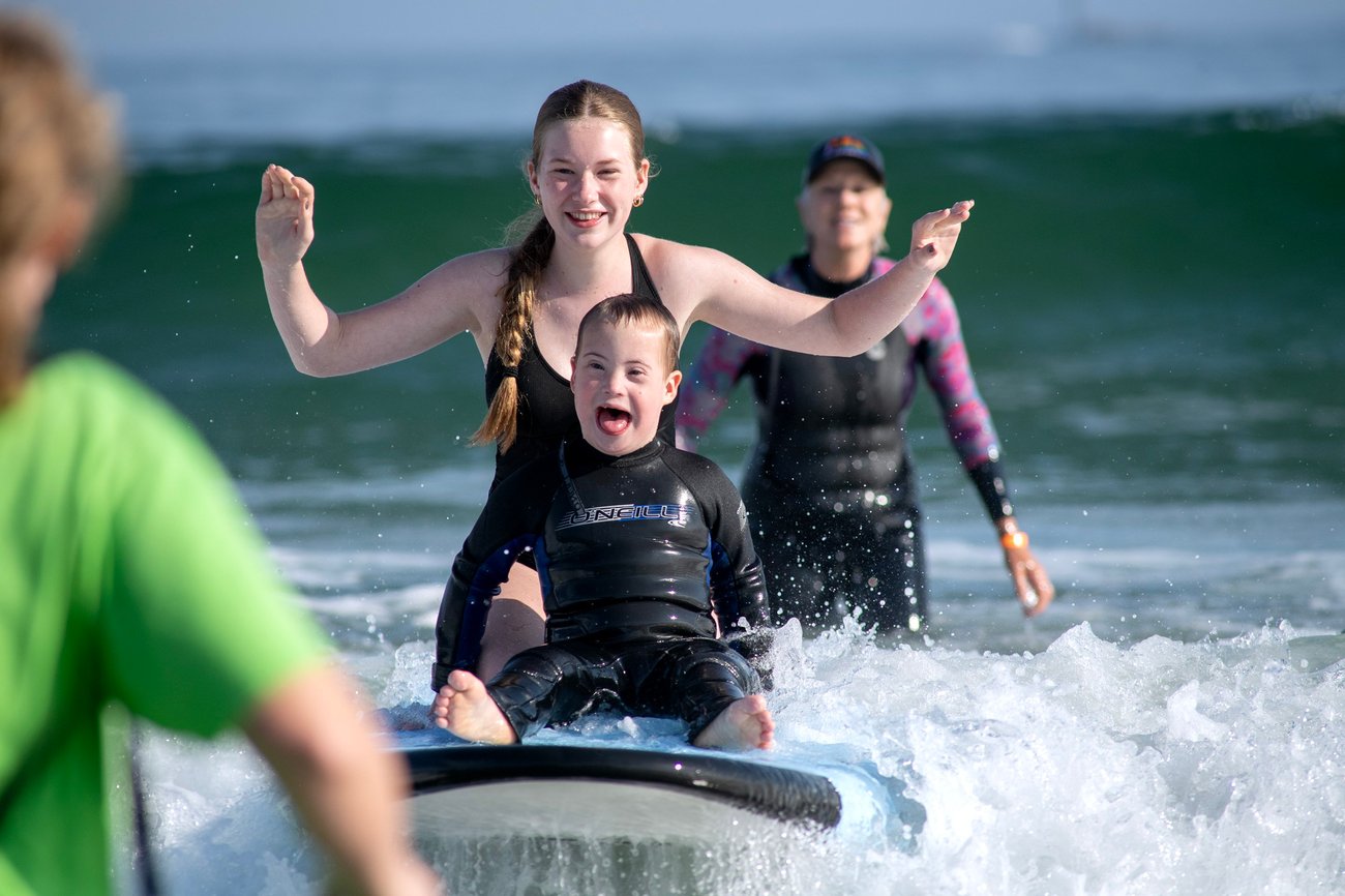 Gabe Holzer, 7, and his 12-year-old sister, Avery Holzer, ride a wave during the Special Surfers' second session of the summer at Gooch’s Beach in Kennebunk on July 9, 2025. |