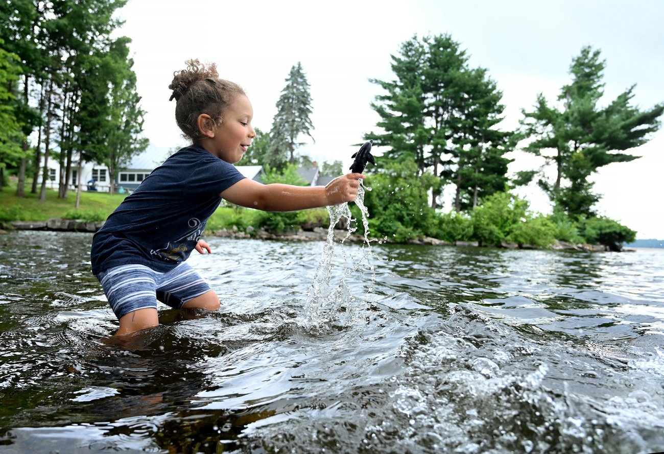 Reece Paul, 3 of Belgrade, pulls his toy porpoise from the water while playing along the edge of Long Pond with this mother Taylor Harrington and sister Whitney Paul, 18 months, at Peninsula Park in Belgrade on July 30, 2024. BUY IMAGE |