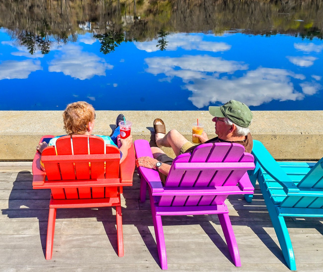 Pat Baker, left, and Leroy Baker, of West Gardiner, relax with cold beverages in colorful Adirondack chairs along the banks of Kennebec River on a warm sunny April 28, 2023, at Granite City Park in Hallowell. |
