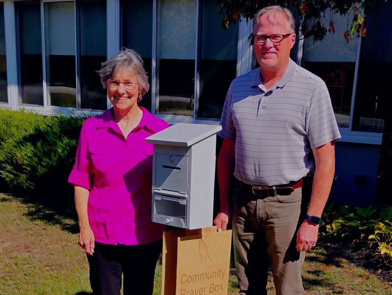 Ave. property. "All those in need of prayer are invited to drive up or walk up, fill out a brief form, and deposit it in a locked slot," writes Wanda Sprague, pictured above with fellow Worship Committee member Peter Keniston. "Prayer recipients will be prayerfully remembered during worship and for the duration of the following week. The names of those to be remembered can be noted by their first name only and the person requesting the prayers has the option of remaining anonymous." Email Sprague for more information.