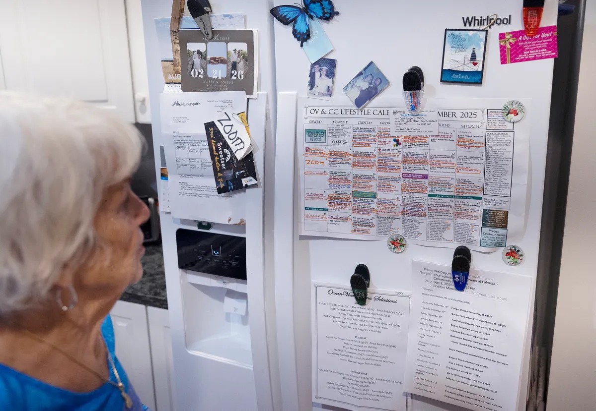 | Sherlyn Morrissette, a resident at OceanView in Falmouth, takes a look at her busy activity schedule. (Derek Davis/Staff Photographer)