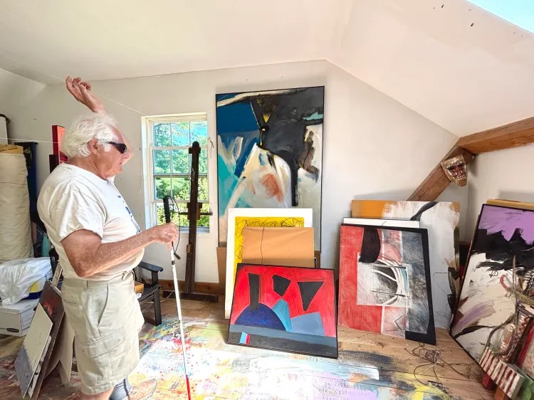 | Painter Denis Boudreau with several of his paintings in his studio in Falmouth on July 18. Boudreau was recently featured in a documentary short that debuted at the Maine International Film Festival to acclaim. (Sophie Burchell/Staff Writer)
