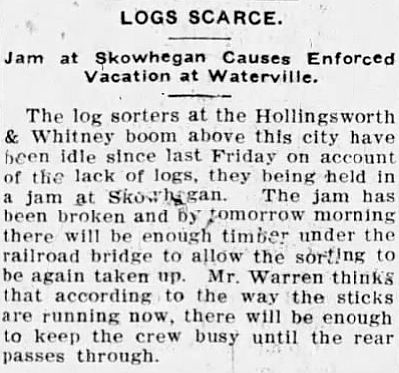 July 31, 1907: "The log sorters at the Hollingsworth & Whitney boom above this city have been idle since last Friday on account of the lack of logs, they being held in a jam at Skowhegan."