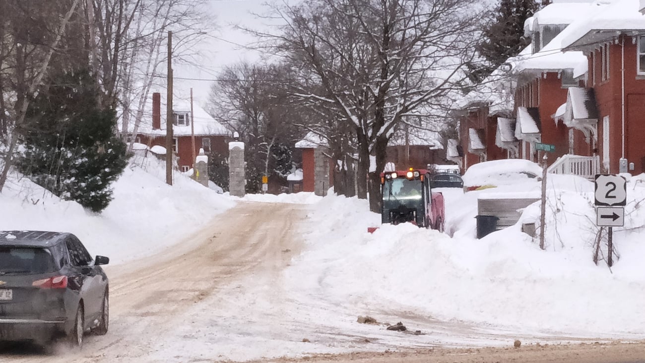 A Rumford Public Works sidewalk plow clears a path on a portion of Somerset Street last week following the 20 inches of powder snow that Winter Storm Fern brought here. The cold weather that followed prevented most all of it from melting as well. (Bruce Farrin/Staff Writer) |