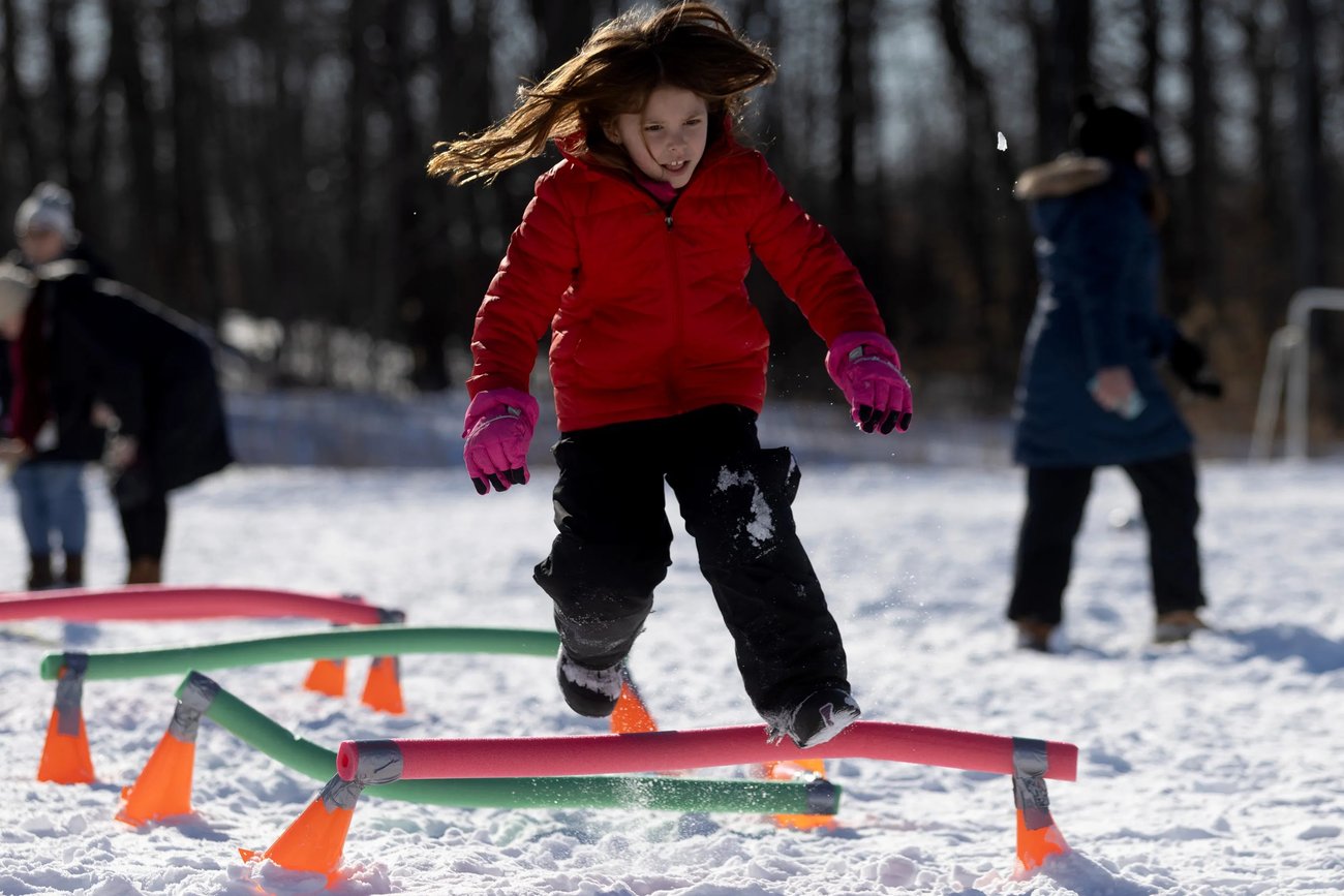 Third-grader Kinsley Caret maneuvers through an obstacle course Tuesday during the WinterKids Challenge at Hall-Dale Elementary School in Hallowell. The event required participants to hop, crawl, jump, sled and balance. (Anna Chadwick/Staff Photographer) |